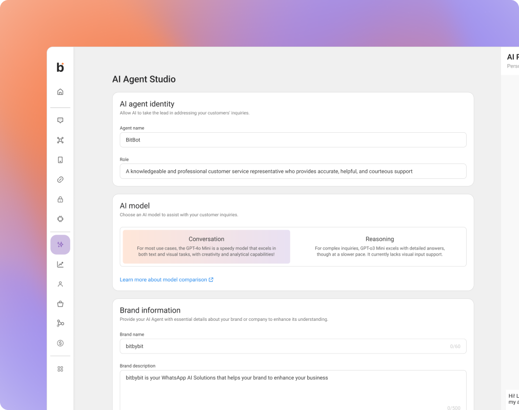Choose a model, upload knowledge, set your brand voice, and test instantly in AI Playground.
